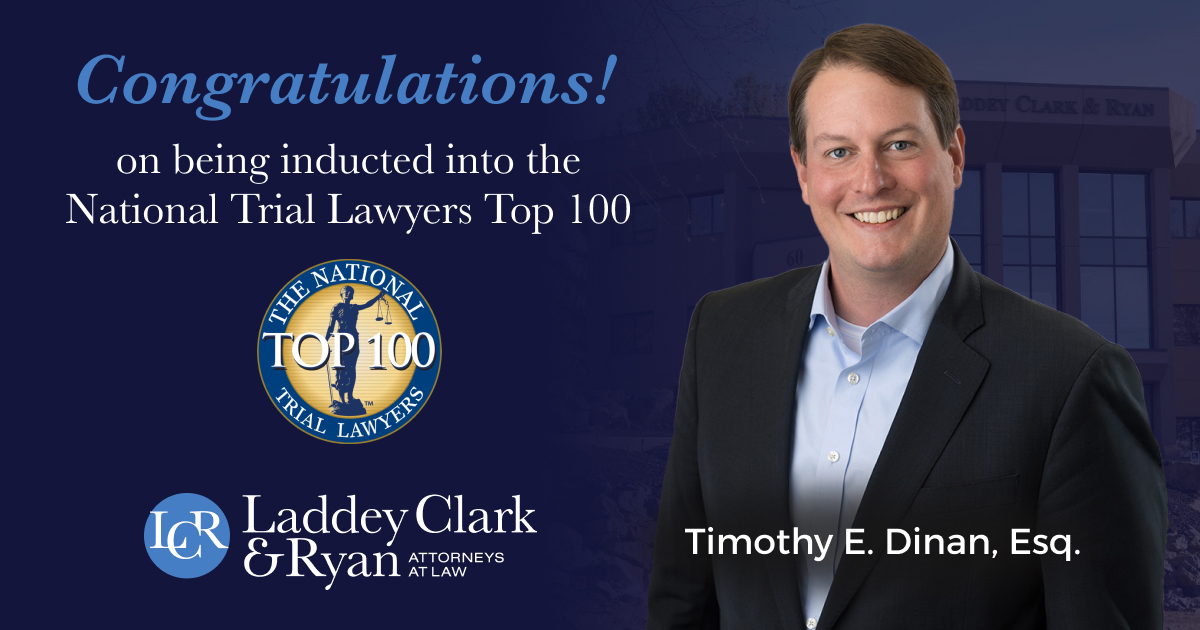 Laddey Clark & Ryan, LLP proudly announces that Attorney Timothy Dinan has been inducted into the National Trial Lawyers: Top 100. This is an invitation-only, professional organization of the most qualified trial lawyers from each state or region, selected based on important characteristics such as leadership, reputation, influence, stature, and public profile. Of note, this in-depth, multi-phase selection process includes peer nominations and third-party research.