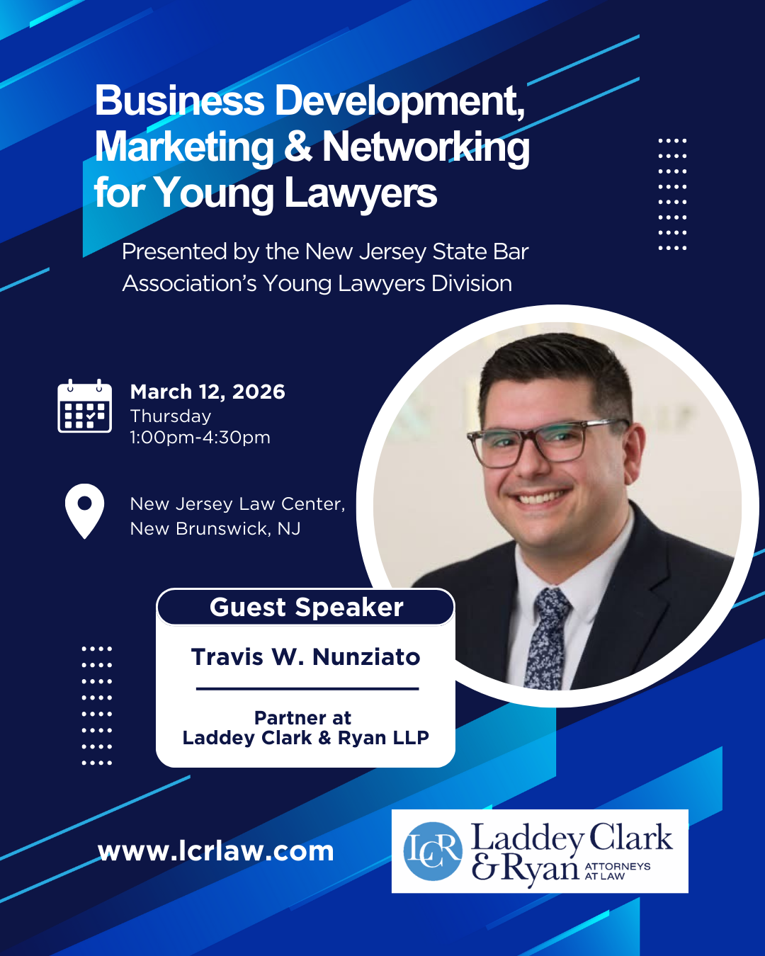 On March 12th, Laddey Clark & Ryan’s Travis W. Nunziato will be a speaker at a program, “Business Development, Marketing & Networking for Young Lawyers,” presented by the New Jersey State Bar Association’s Young Lawyers Division.