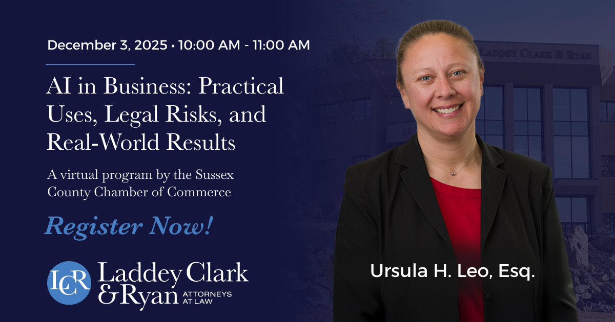 The Sussex County Chamber of Commerce will be presenting a virtual program on Wednesday, December 3: AI in Business: Practical Uses, Legal Risks, and Real-World Results via Zoom. LCR’s Ursula H. Leo, practice leader of our employment law practice, will be a member of the panel of speakers.