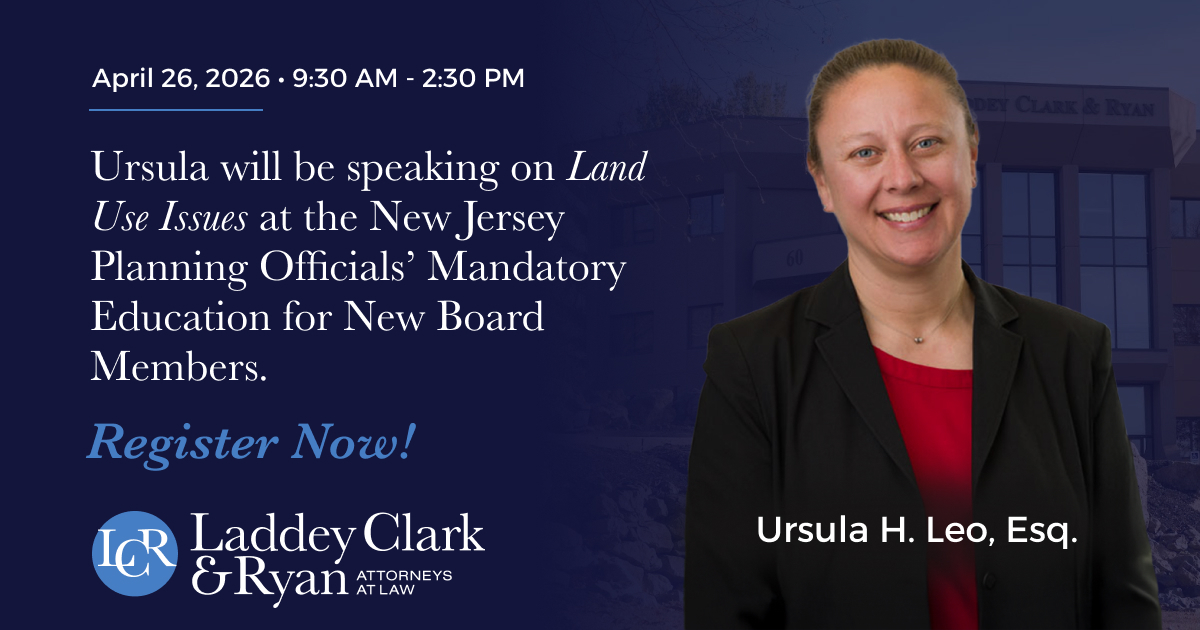 On Sunday, April 26, Ursula H. Leo will be one of the presenters at the New Jersey Planning Officials’ Mandatory Education for New Board Members, speaking on Land Use issues. The virtual program will be 9:30 a.m. – 2:30 p.m. To register, click here: https://www.njpo.org/events/mandatory-education-for-new-board-members—4262026/register